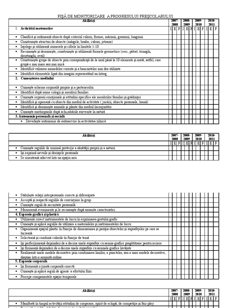 Fisă De Monitorizare A Progresului Prescolarului