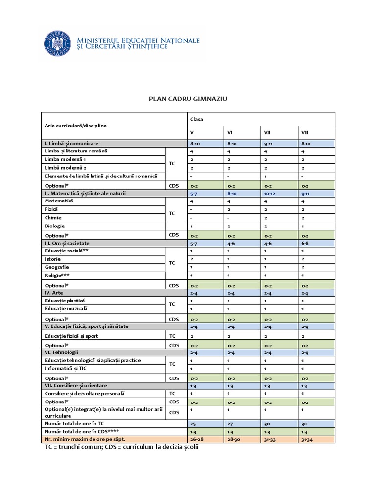 Plan Cadru Gimnaziu Tc Trunchi Comun Cds Curriculum La Decizia școlii