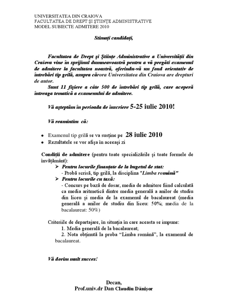 5500 Subiecte Pentru Admiterea La Facultatea De Drept Si Stiinte Administrative 2010